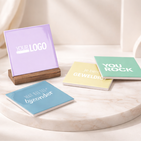 Met custom tegeltjes geef je een origineel relatiegeschenk dat mensen écht neerzetten. Laat een tegeltje maken in jouw huisstijl, met een spreuk van jouw bedrijf of een knipoog naar collega’s. Perfect om uit te delen aan collega's, tijdens een event of als extra verrassing in een zomer- of kerstpakket.