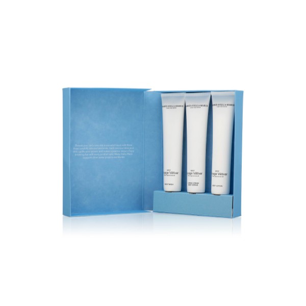 De set bestaat uit een body wash, body scrub en body lotion van elk 50 ml. Perfect om mee te nemen op reis of voor in een (kleine) handtas. De geur is fris en kruidig, met tonen van vetiver, salie en zeezout, geliefd bij zowel mannen als vrouwen. Het compacte doosje past makkelijk door de brievenbus, dus ideaal als mailing of attentie voor medewerkers.