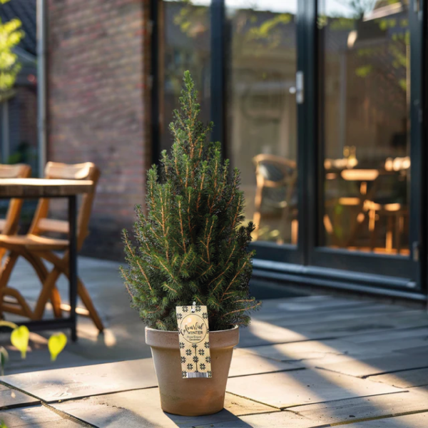 De mini kerstboom is een Picea glauca ‘Conica’, een sterke dwergspar die weinig verzorging nodig heeft. Tijdens de feestdagen staat hij gezellig binnen, daarna kan hij gewoon de tuin in. De boom zit in een pot, met daarover een jute zak. Deze zak kun je laten bedrukken met jouw bedrijfslogo, maar het is ook mogelijk een handgeschreven kaartje met een persoonlijke boodschap aan het boompje te laten bevestigen.