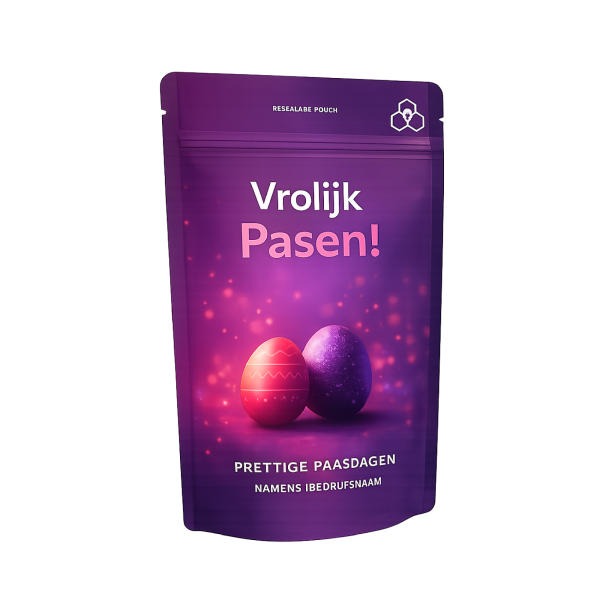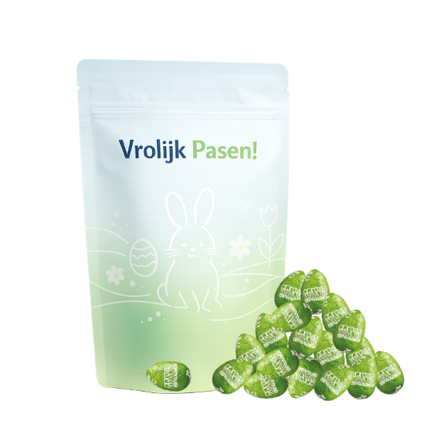 De paaseitjes zitten in een stevige stazak die full colour kan worden bedrukt met jouw ontwerp. Verkrijgbaar in verschillende formaten (S, M en L), dus je kiest zelf hoeveel chocolade je weggeeft. Ga voor een vrolijke assorti mix of kies juist één smaak. En wil je het extra laten aansluiten op je huisstijl? Dan kunnen we de eitjes ook mixen, denk aan geel en blauw, groen en wit of oranje en roze.